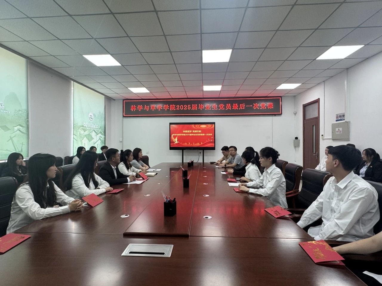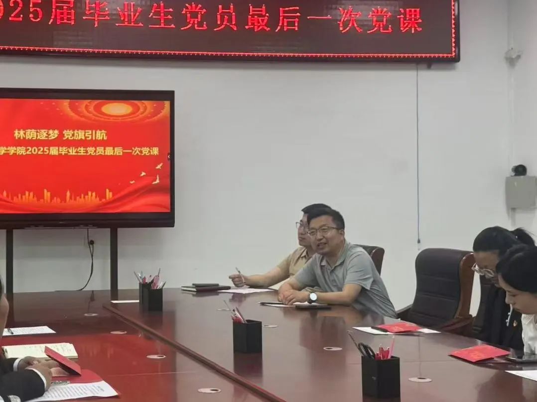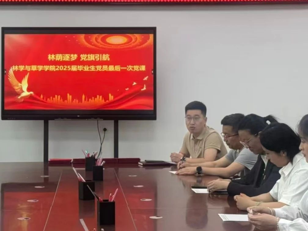 为扎实推进毕业生党员教育管理工作,进一步强化毕业生党员的身份意识和责任意识,5月29日,学院学生第一党支部联合研究生党支部在201会议室举办了“林荫逐梦,党旗引航”2025届毕业生党员最后一次党课专题教育活动。学院党委书记沈广会、研究生党支部书记孙思琦、学生第一党支部书记冷雪冰及全体毕业生党员参加了活动。党课由学院党委副书记邓鹏飞主持。