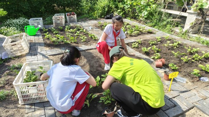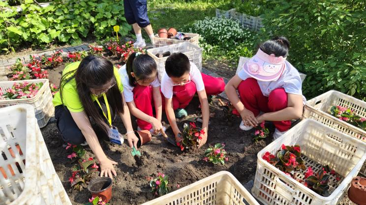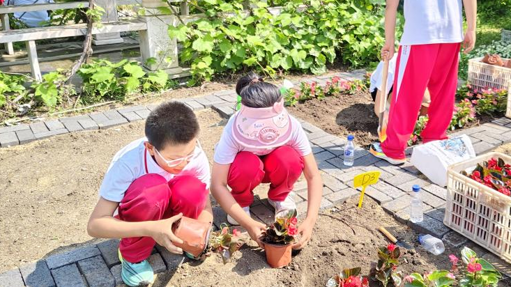 随后,学生们按花、果、蔬菜三类进行分组,每组负责栽种一种类型的植物。在志愿者的带领下,学生们对基本栽种方法进行了学习,掌握了翻土、移栽、浇水等种植技术。栽种过程中,小学生们展现出积极的劳动态度,大家不畏炎热,不怕辛苦,用汗水为这片小小的田地带来一份份生机与活力。经过大家近3个小时的耕种,最终小菜园、小花园和小果园种植完成。