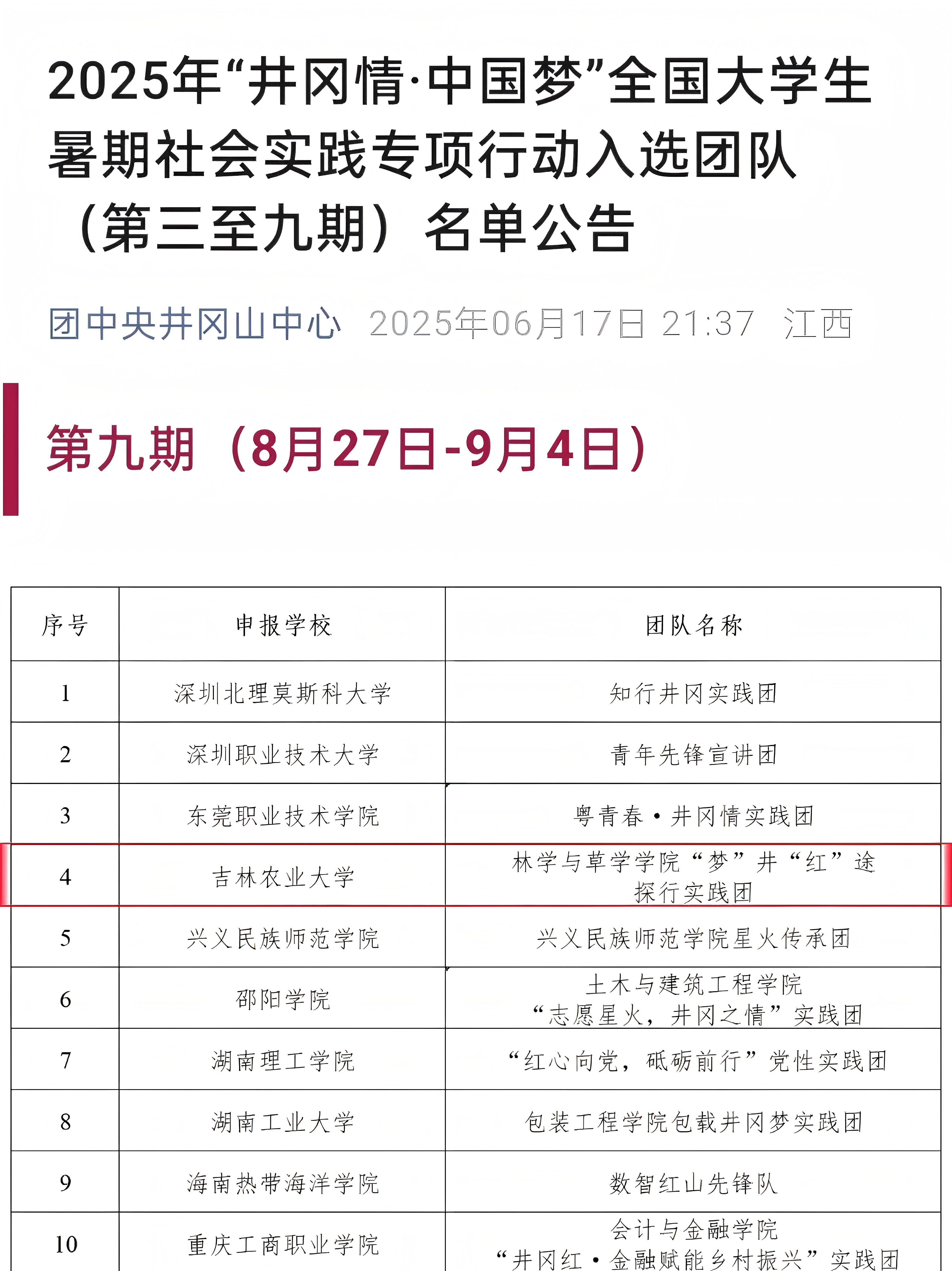 近期,全国青少年井冈山革命传统教育基地公布了2025年度“井冈情·中国梦”全国大学生暑期社会实践专项行动入选团队名单,学院“梦”井“红”途探行实践团队再次成功入选。这是学院社会实践团队第二次被选中参与该社会实践活动。此次,实践团队的成员们将于8月27日至9月4日前往井冈山,展开为期9天的实践活动。
