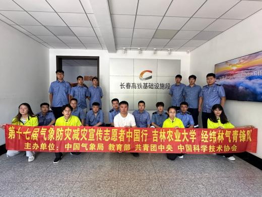 8月11日-15日,学院“经纬林气青锋队”气象宣讲志愿团联合吉林师范大学赴中国铁路沈阳局集团有限公司长春高铁基础设施段、黑龙江省绥化市张维镇,共同开展第十七届“气象防灾减灾宣传志愿者中国行”活动。志愿团由学院辅导员孙卿和吉林师范大学地理科学与旅游学院副院长杨赫鸣带队,两所学校共有10余名研究生、本科生参加了此次社会实践活动。