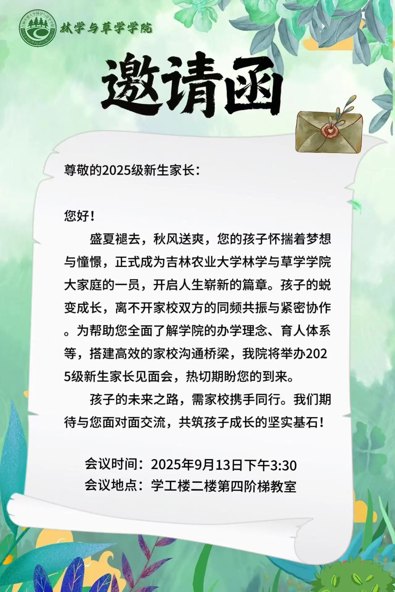 为使您深入掌握孩子大学阶段的学业规划、日常管理细则与学院各项保障措施,搭建起家校之间坚实的沟通桥梁,林学与草学学院将召开2025级新生家长座谈会,诚挚邀请您的出席,共话孩子成长。