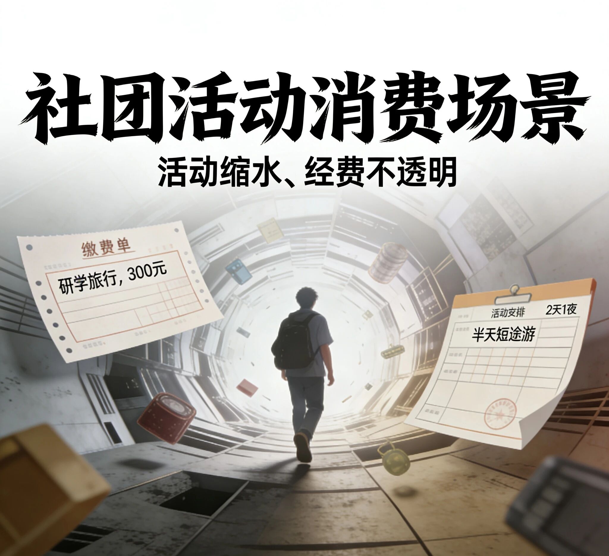 有同学报名社团“研学旅行”,缴纳300元费用后,活动从原定的2天1夜缩减为半天短途游,承诺的专业讲解、餐饮住宿均未兑现,经费去向也不透明。